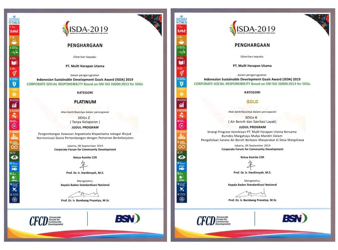 Platinum untuk Kategori Ketahanan Pangan dan Gold untuk Kategori Air Bersih dan Sanitasi Layak